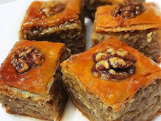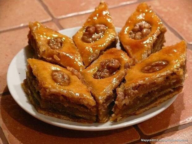 Шаг 7 Последним слоем должно быть тесто. Разрезать получившийся пирог на ромбики, смазать желтком, украсить орешками.Выпекать минут 40-50 при 200 градусах.